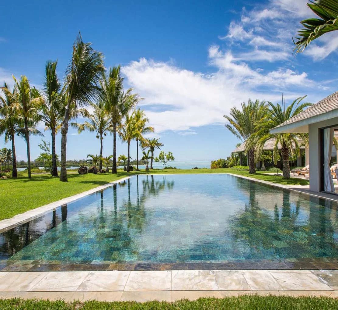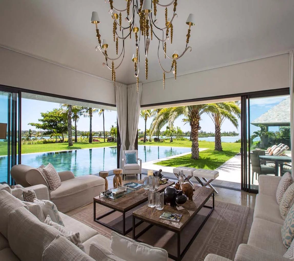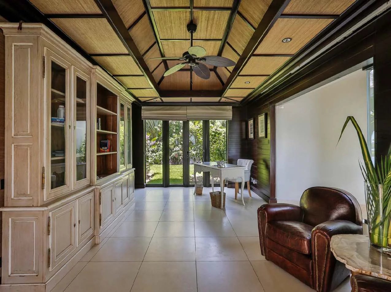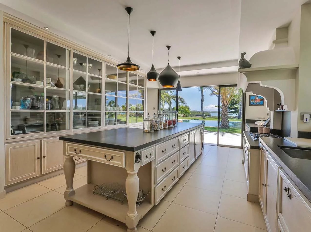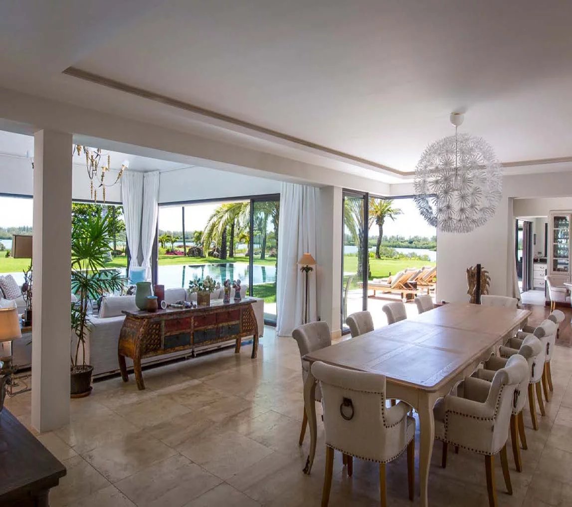 Les vastes espaces de réception sont baignés de lumière, tandis que l’architecture contemporaine privilégie la fluidité et les larges ouvertures. Celles-ci prolongent naturellement les pièces de vie vers l’extérieur, où la terrasse, la piscine et le jardin paysager créent un environnement intime et apaisant, parfaitement adapté au climat mauricien.