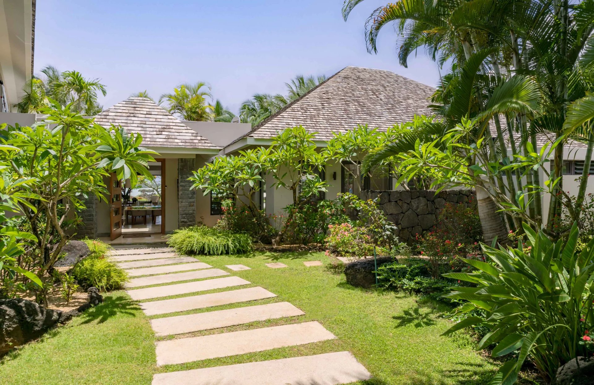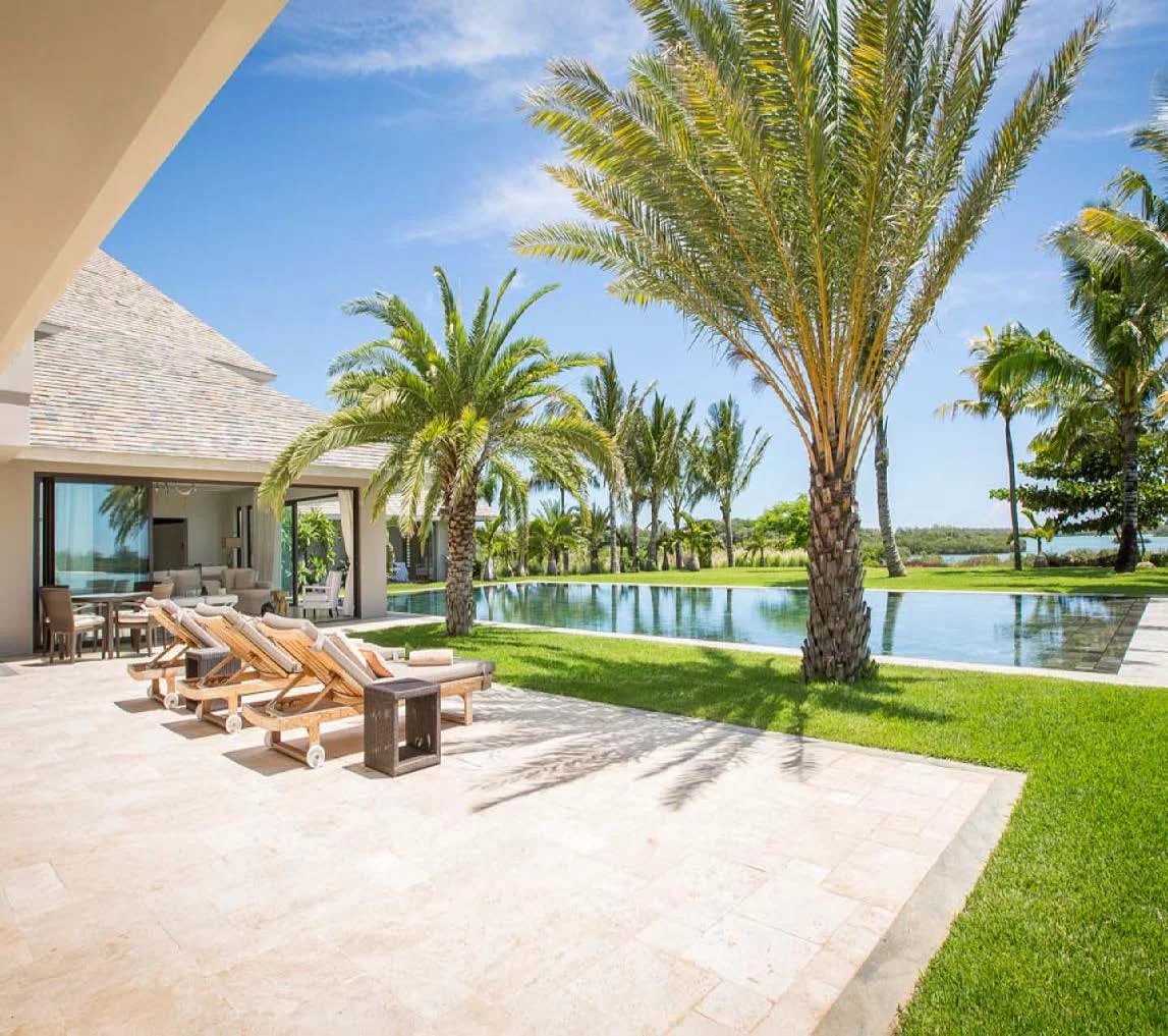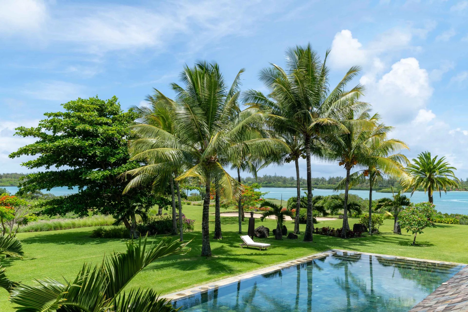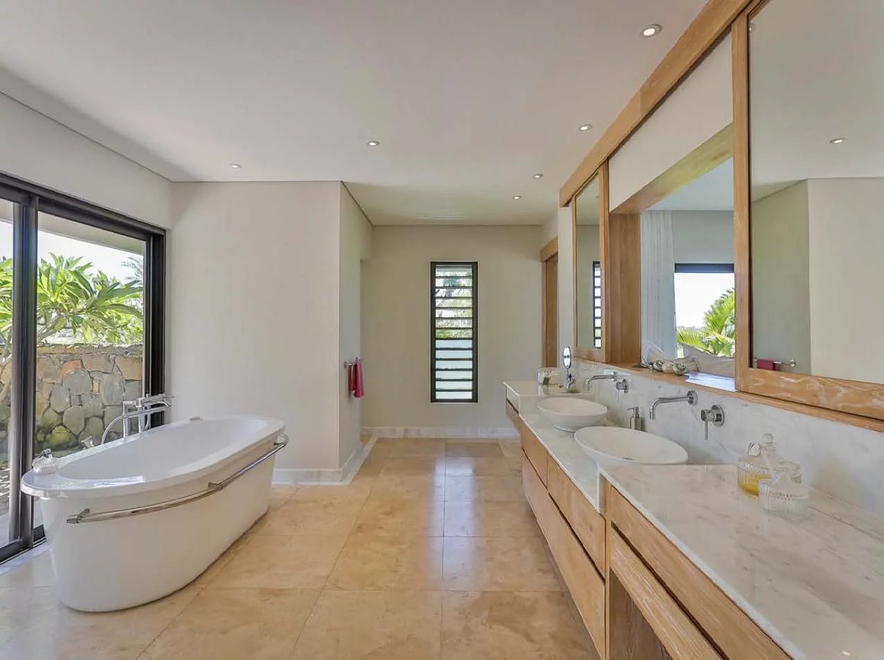 Les vastes espaces de réception sont baignés de lumière, tandis que l’architecture contemporaine privilégie la fluidité et les larges ouvertures. Celles-ci prolongent naturellement les pièces de vie vers l’extérieur, où la terrasse, la piscine et le jardin paysager créent un environnement intime et apaisant, parfaitement adapté au climat mauricien.