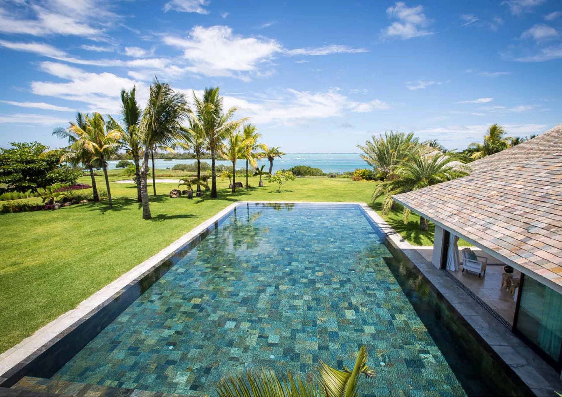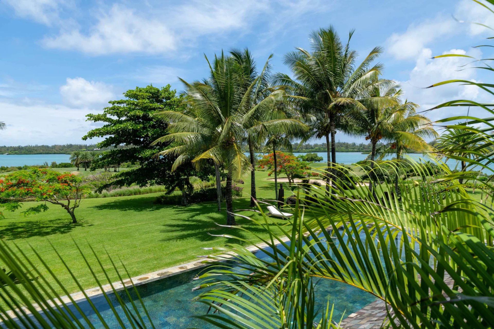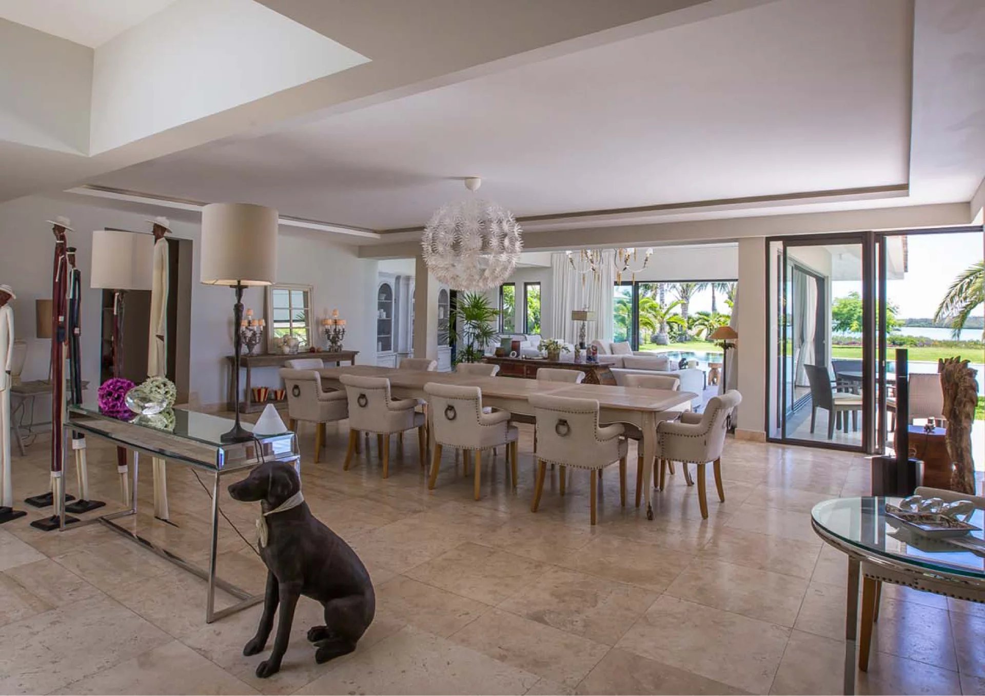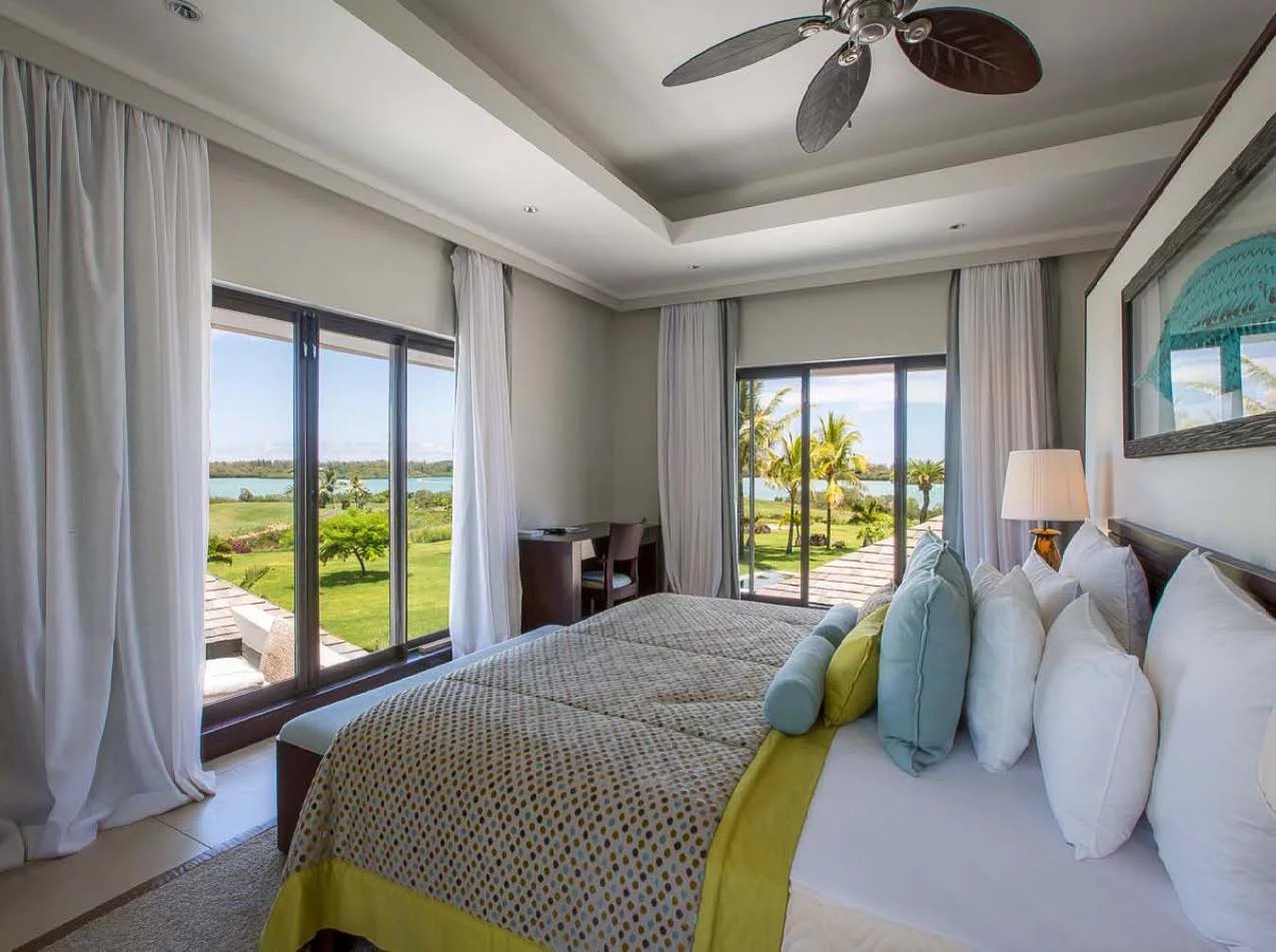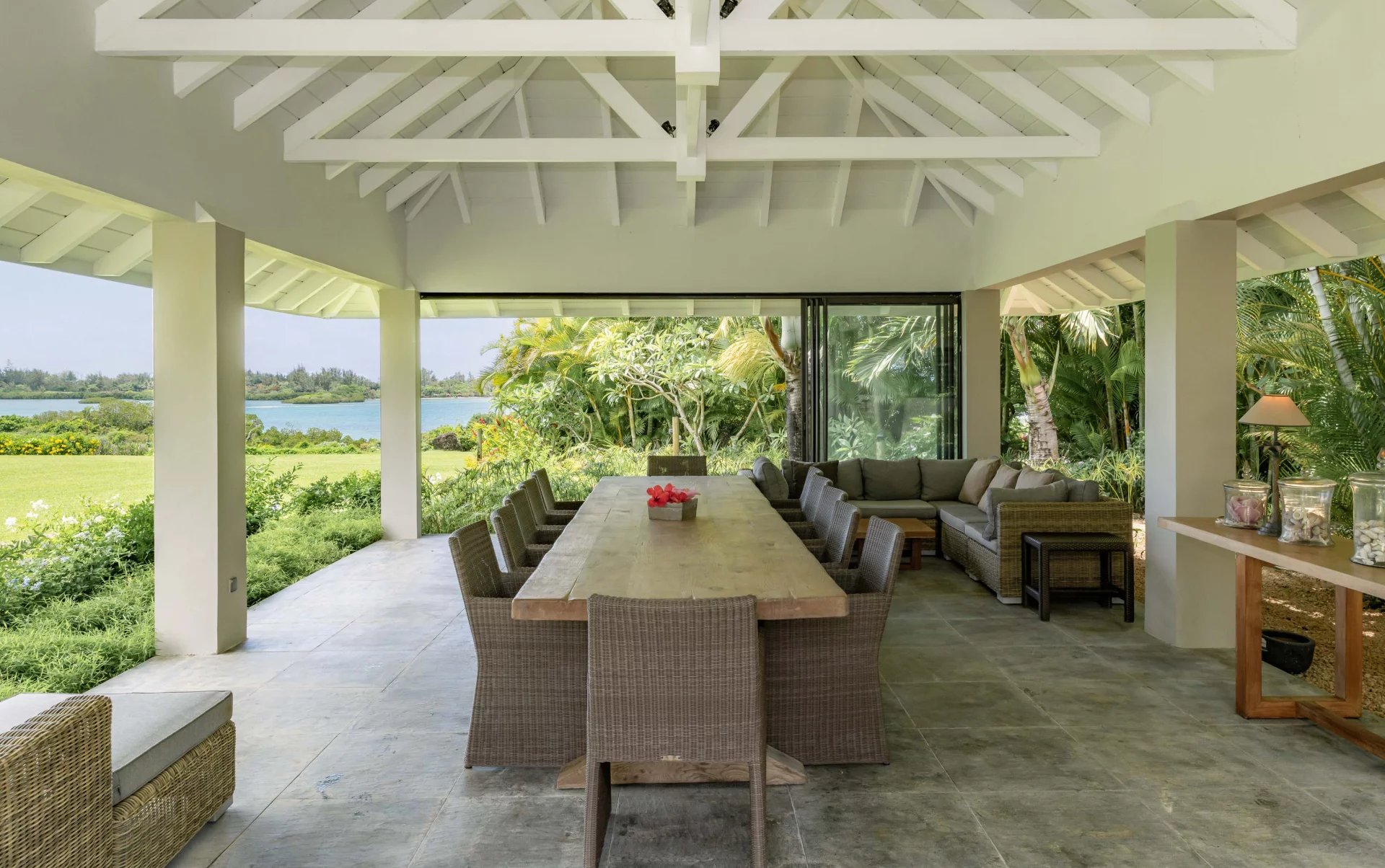 Les vastes espaces de réception sont baignés de lumière, tandis que l’architecture contemporaine privilégie la fluidité et les larges ouvertures. Celles-ci prolongent naturellement les pièces de vie vers l’extérieur, où la terrasse, la piscine et le jardin paysager créent un environnement intime et apaisant, parfaitement adapté au climat mauricien.