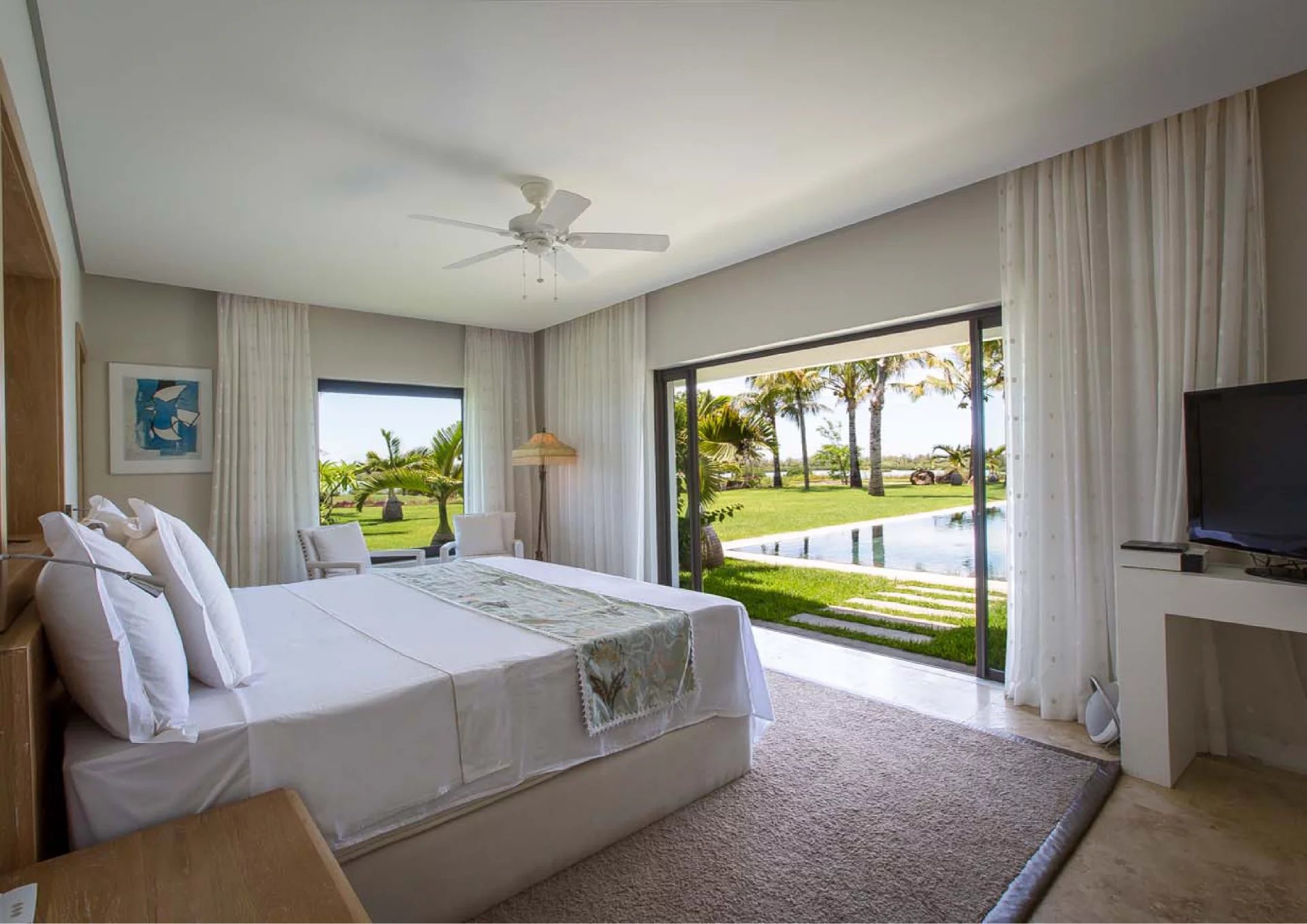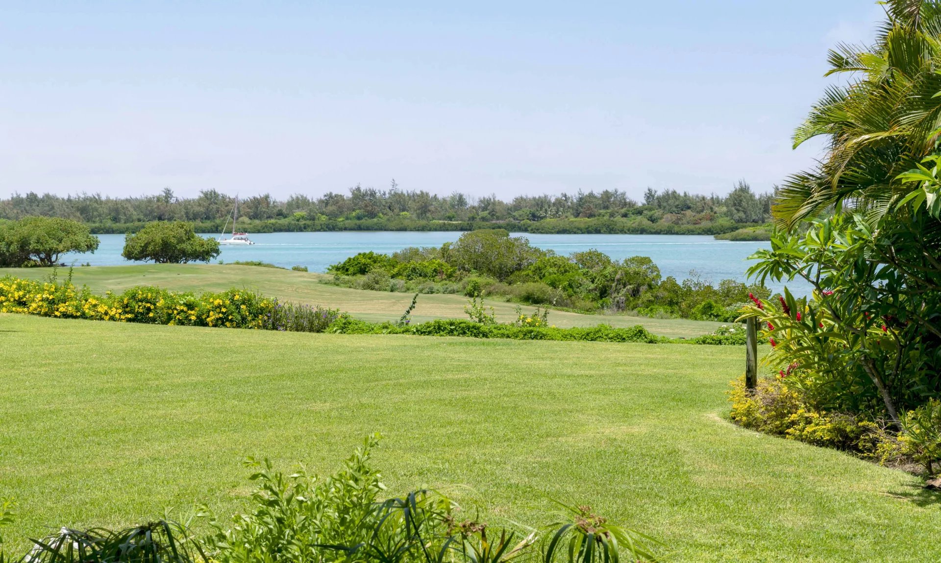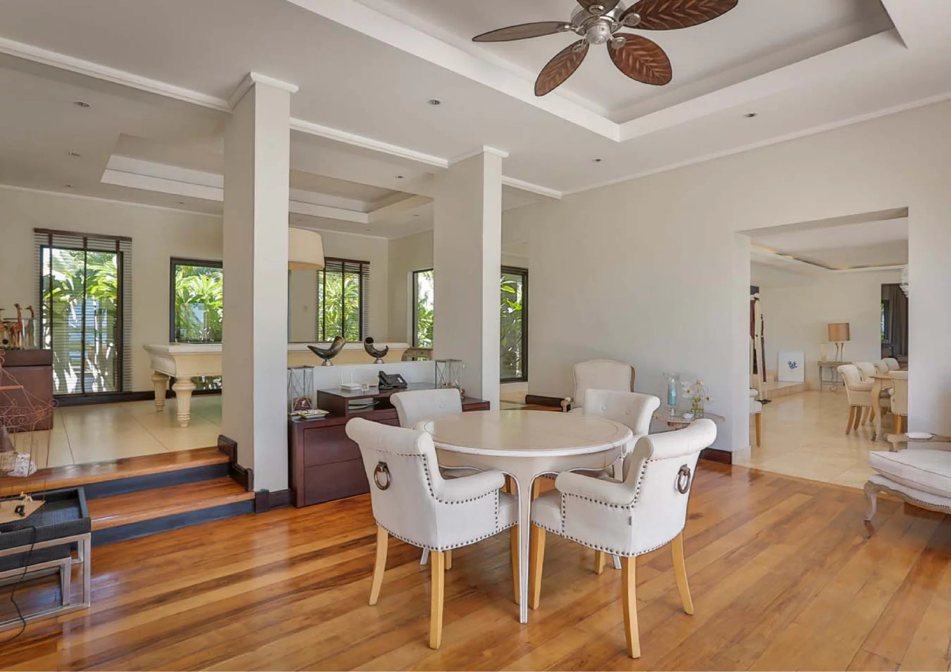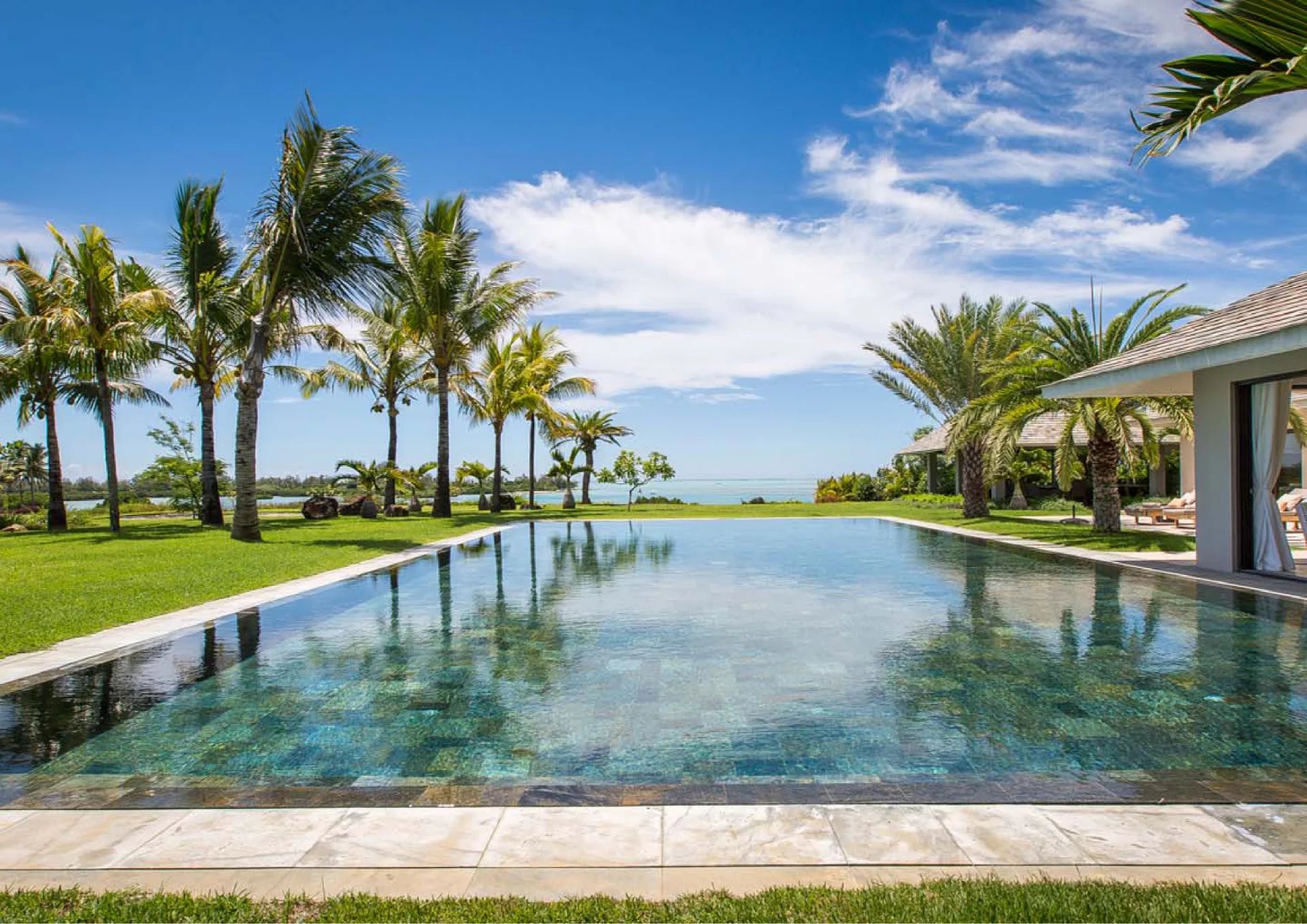 Les vastes espaces de réception sont baignés de lumière, tandis que l’architecture contemporaine privilégie la fluidité et les larges ouvertures. Celles-ci prolongent naturellement les pièces de vie vers l’extérieur, où la terrasse, la piscine et le jardin paysager créent un environnement intime et apaisant, parfaitement adapté au climat mauricien.